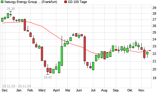 Mit dem Rücksetzer auf 22,40 EUR hat die Naturgy Energy Group-Aktie am 22.11.2024 die 100-Tage-Linie nach unten gekreuzt.