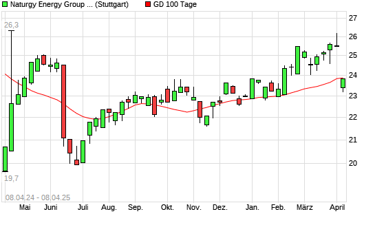 Mit dem Rücksetzer auf 23,60 EUR hat die Naturgy Energy Group-Aktie am 07.04.2025 die 100-Tage-Linie nach unten gekreuzt.