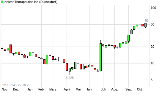 Mit dem Anstieg auf 53,50 EUR hat die Nektar Therapeutics-Aktie (ISIN US6402683063) am 21.10.2025 ein neues 12-Monats-Hoch erreicht und damit den Kurs vom 25.09.2025 eingestellt.