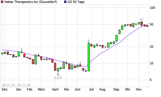 Mit dem Rücksetzer auf 47,20 EUR hat die Nektar Therapeutics-Aktie am 21.11.2025 die 50-Tage-Linie nach unten gekreuzt.
