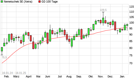Mit dem Anstieg auf 97,90 EUR hat die Nemetschek-Aktie am 15.01.2025 die 100-Tage-Linie nach oben gekreuzt.