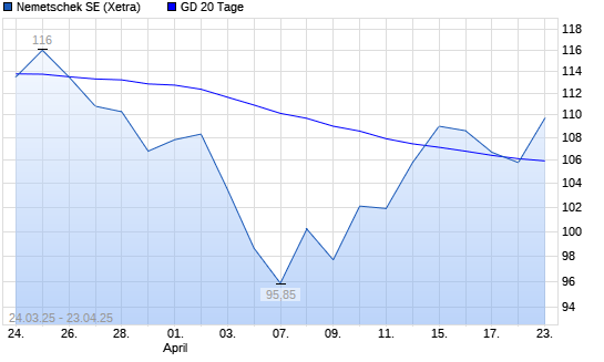 Mit dem Rücksetzer auf 104,20 EUR hat die Nemetschek-Aktie am 22.04.2025 die 20-Tage-Linie nach unten gekreuzt.