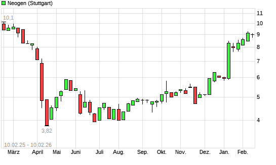 Mit dem Anstieg auf 8,95 EUR hat die Neogen-Aktie (ISIN US6404911066) am 09.02.2026 ein neues 6-Monats-Hoch erreicht und damit den Kurs vom 06.02.2026 eingestellt.