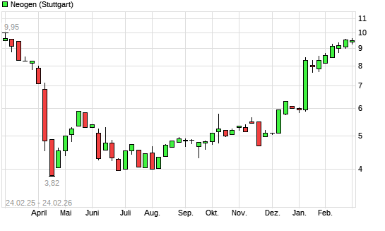 Mit dem Anstieg auf 9,40 EUR hat die Neogen-Aktie (ISIN US6404911066) am 23.02.2026 ein neues 6-Monats-Hoch erreicht und damit den Kurs vom 19.02.2026 eingestellt.