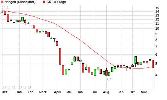 Mit dem Rücksetzer auf 4,68 EUR hat die Neogen-Aktie am 21.11.2025 die 100-Tage-Linie nach unten gekreuzt.