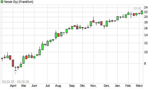 Mit dem Anstieg auf 22,10 EUR hat die Neste OYJ-Aktie (ISIN FI0009013296) am 02.03.2026 ein neues 12-Monats-Hoch erreicht und damit den Kurs vom 26.01.2026 eingestellt.