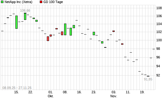 Mit dem Anstieg auf 100,00 EUR hat die NetApp-Aktie am 26.11.2025 die 100-Tage-Linie nach oben gekreuzt.