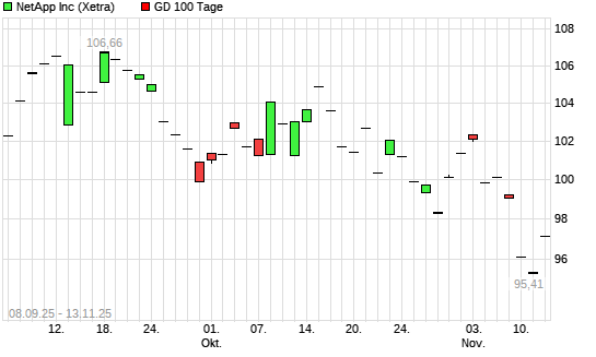 Mit dem Rücksetzer auf 94,28 EUR hat die NetApp-Aktie am 12.11.2025 die 100-Tage-Linie nach unten gekreuzt.