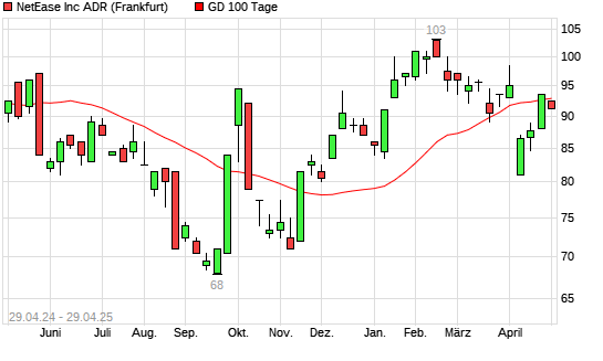 Mit dem Rücksetzer auf 92,20 EUR hat die NetEase-Aktie am 28.04.2025 die 100-Tage-Linie nach unten gekreuzt.