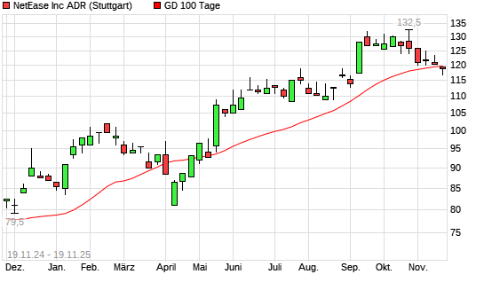 Mit dem Rücksetzer auf 117,50 EUR hat die NetEase-Aktie am 18.11.2025 die 100-Tage-Linie nach unten gekreuzt.