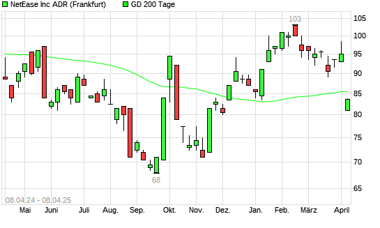 Mit dem Rücksetzer auf 83,80 EUR hat die NetEase-Aktie am 07.04.2025 die 200-Tage-Linie nach unten gekreuzt.
