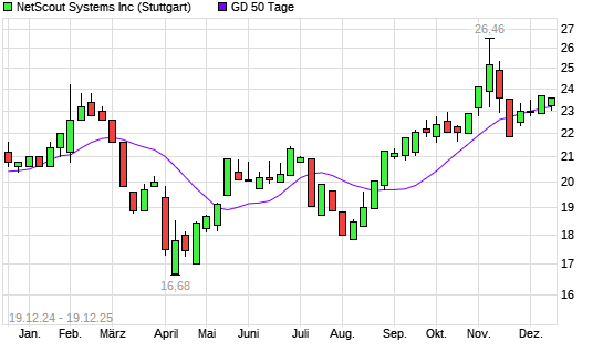 Mit dem Rücksetzer auf 22,93 EUR hat die NetScout Systems-Aktie am 18.12.2025 die 50-Tage-Linie nach unten gekreuzt.