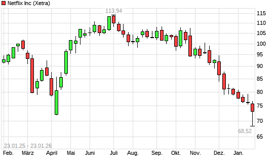 Mit dem Rücksetzer auf 71,39 EUR hat die Netflix-Aktie (ISIN US64110L1061) am 22.01.2026 ein neues 12-Monats-Tief erreicht und damit den Kurs vom 21.01.2026 eingestellt.