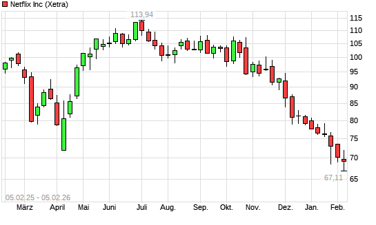 Mit dem Rücksetzer auf 67,84 EUR hat die Netflix-Aktie (ISIN US64110L1061) am 04.02.2026 ein neues 12-Monats-Tief erreicht und damit den Kurs vom 03.02.2026 eingestellt.