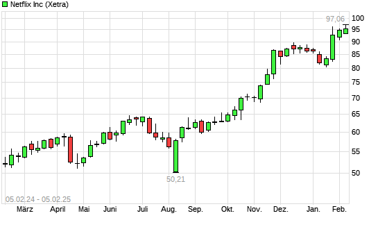Mit dem Anstieg auf 953,50 EUR hat die Netflix-Aktie (ISIN US64110L1061) am 04.02.2025 ein neues All-Time-High erreicht und damit den Kurs vom 03.02.2025 eingestellt.