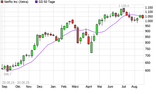 Mit dem Rücksetzer auf 1.039,00 EUR hat die Netflix-Aktie am 19.08.2025 die 50-Tage-Linie nach unten gekreuzt.