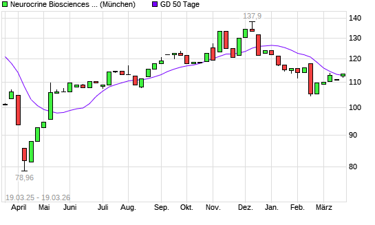 Mit dem Anstieg auf 113,10 EUR hat die Neurocrine Biosciences-Aktie am 18.03.2026 die 50-Tage-Linie nach oben gekreuzt.