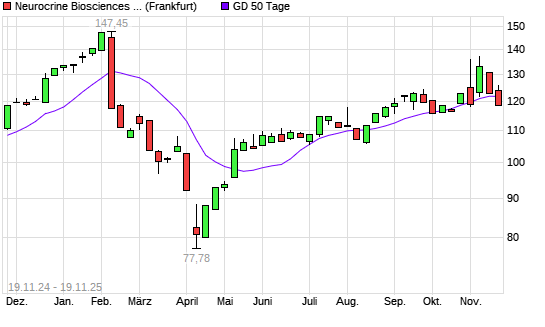 Mit dem Rücksetzer auf 121,65 EUR hat die Neurocrine Biosciences-Aktie am 18.11.2025 die 50-Tage-Linie nach unten gekreuzt.
