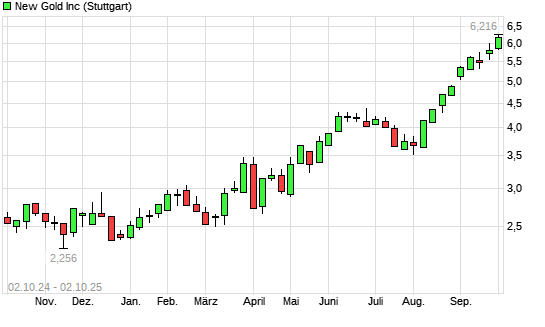 Mit dem Anstieg auf 6,26 EUR hat die New Gold-Aktie (ISIN CA6445351068) am 01.10.2025 ein neues 10-Jahres-Hoch erreicht und damit den Kurs vom 30.09.2025 eingestellt.