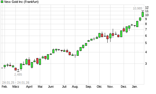 Mit dem Anstieg auf 10,73 EUR hat die New Gold-Aktie (ISIN CA6445351068) am 23.01.2026 ein neues All-Time-High erreicht und damit den Kurs vom 22.01.2026 eingestellt.