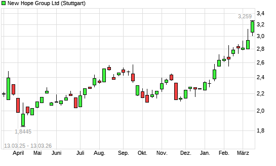 Mit dem Anstieg auf 3,18 EUR hat die New Hope-Aktie (ISIN AU000000NHC7) am 12.03.2026 ein neues 12-Monats-Hoch erreicht und damit den Kurs vom 09.03.2026 eingestellt.