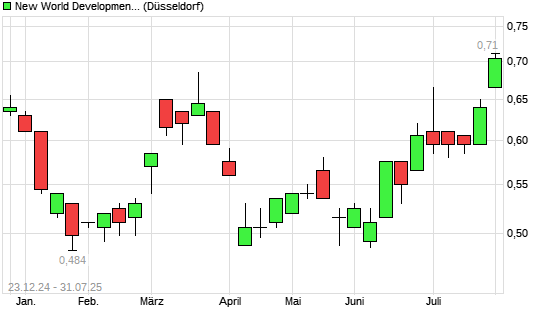 Mit dem Anstieg auf 0,74 EUR hat die New World Development Co.-Aktie (ISIN HK0000608585) am 30.07.2025 ein neues 6-Monats-Hoch erreicht und damit den Kurs vom 29.07.2025 eingestellt.