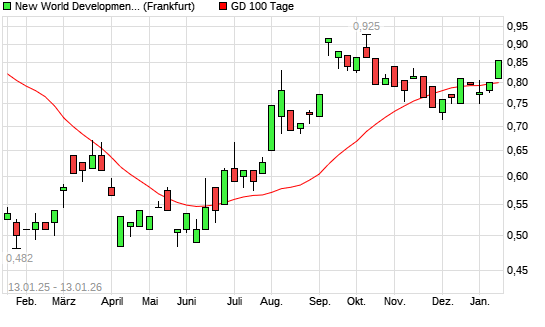 Mit dem Anstieg auf 0,81 EUR hat die New World Development Co.-Aktie am 12.01.2026 die 100-Tage-Linie nach oben gekreuzt.