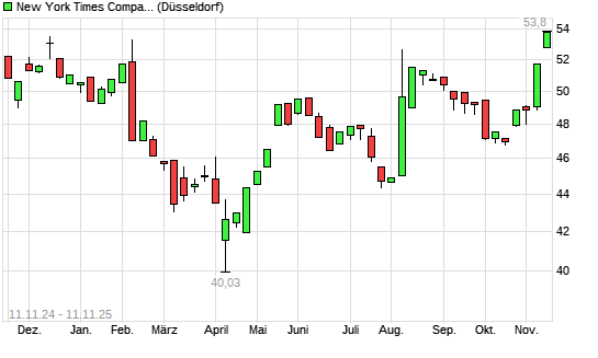 Mit dem Anstieg auf 52,96 EUR hat die New York Times Company-Aktie (ISIN US6501111073) am 10.11.2025 ein neues 6-Monats-Hoch erreicht und damit den Kurs vom 07.08.2025 eingestellt.