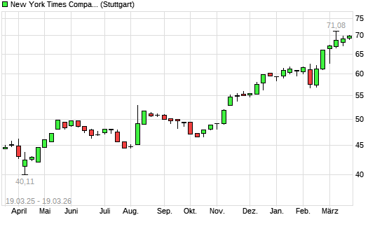 Mit dem Anstieg auf 70,10 EUR hat die New York Times Company-Aktie (ISIN US6501111073) am 18.03.2026 ein neues All-Time-High erreicht und damit den Kurs vom 05.03.2026 eingestellt.