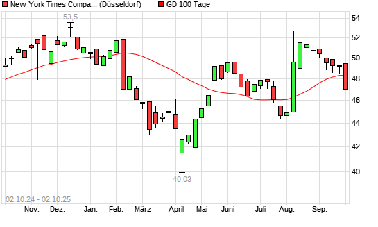 Mit dem Rücksetzer auf 48,34 EUR hat die New York Times Company-Aktie am 01.10.2025 die 100-Tage-Linie nach unten gekreuzt.