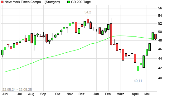 Mit dem Rücksetzer auf 48,48 EUR hat die New York Times Company-Aktie am 21.05.2025 die 200-Tage-Linie nach unten gekreuzt.