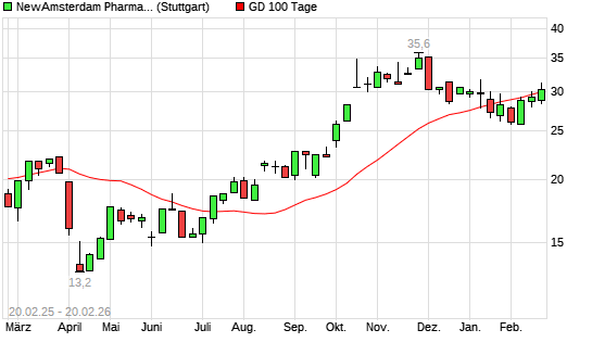 Die Newamsterdam Pharma-Aktie befindet sich jetzt sowohl in kurzfristigen, mittelfristigen als auch in langfristigen Aufwärtstrends, da der Kurs gestern die 100-Tage-Linie gekreuzt hat. Die Eindeutigkeit der Aufwärtstrends in allen Zeithorizonten ist aber noch nicht ganz sicher, da der Kurs erst um 0,70 Prozent über dem 100-Tage-GD bei 29,59 notiert, der zudem erst gestern gekreuzt wurde.