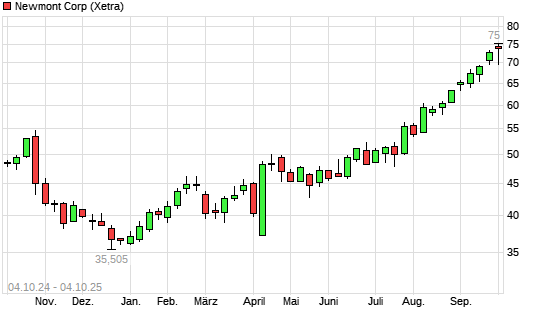 Mit dem Anstieg auf 74,49 EUR hat die Newmont Mining-Aktie (ISIN US6516391066) am 03.10.2025 ein neues 3-Jahres-Hoch erreicht und damit den Kurs vom 01.10.2025 eingestellt.