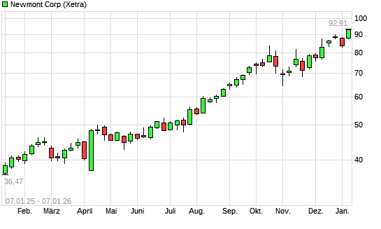 Mit dem Anstieg auf 92,96 EUR hat die Newmont Mining-Aktie (ISIN US6516391066) am 06.01.2026 ein neues All-Time-High erreicht und damit den Kurs vom 22.12.2025 eingestellt.