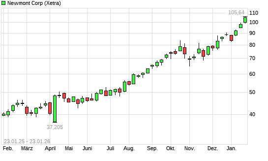Mit dem Anstieg auf 103,34 EUR hat die Newmont Mining-Aktie (ISIN US6516391066) am 22.01.2026 ein neues All-Time-High erreicht und damit den Kurs vom 21.01.2026 eingestellt.