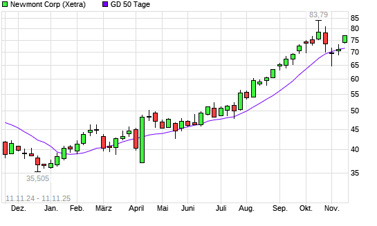 Mit dem Anstieg auf 75,00 EUR hat die Newmont Mining-Aktie am 10.11.2025 die 50-Tage-Linie nach oben gekreuzt.