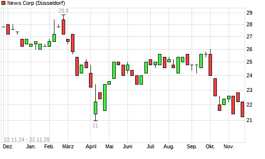 Mit dem Rücksetzer auf 21,20 EUR hat die News Corp A-Aktie (ISIN US65249B1098) am 21.11.2025 ein neues 6-Monats-Tief erreicht und damit den Kurs vom 07.11.2025 eingestellt.