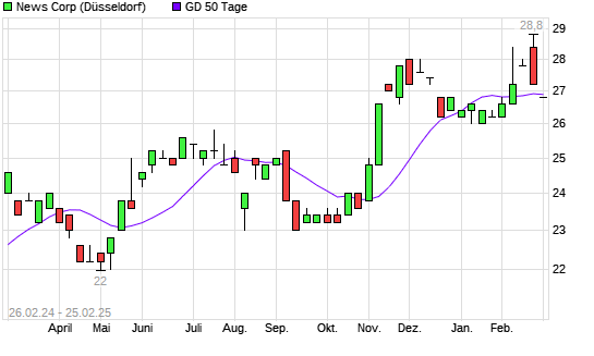 Mit dem Rücksetzer auf 26,80 EUR hat die News Corp A-Aktie am 24.02.2025 die 50-Tage-Linie nach unten gekreuzt.