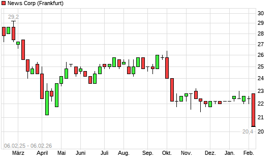Mit dem Rücksetzer auf 19,00 EUR hat die News Corp A-Aktie (ISIN US65249B1098) am 06.02.2026 ein neues 12-Monats-Tief erreicht und damit den Kurs vom 05.02.2026 eingestellt.Die News Corp ...weiterlesen