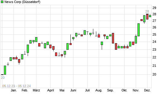 Mit dem Anstieg auf 28,00 EUR hat die News Corp A-Aktie (ISIN US65249B1098) am 04.12.2024 ein neues All-Time-High erreicht und damit den Kurs vom 26.11.2024 eingestellt.Die News Corp A-Aktie ...weiterlesen