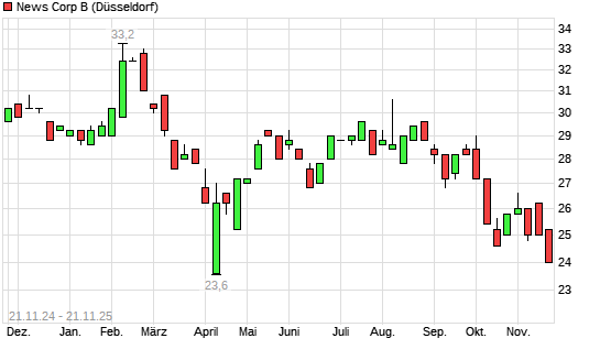 Mit dem Rücksetzer auf 24,00 EUR hat die News Corp B-Aktie (ISIN US65249B2088) am 20.11.2025 ein neues 6-Monats-Tief erreicht und damit den Kurs vom 07.11.2025 eingestellt.