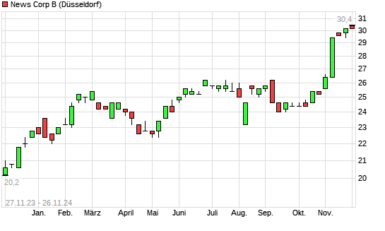 Mit dem Anstieg auf 30,60 EUR hat die News Corp B-Aktie (ISIN US65249B2088) am 25.11.2024 ein neues All-Time-High erreicht und damit den Kurs vom 22.11.2024 eingestellt.