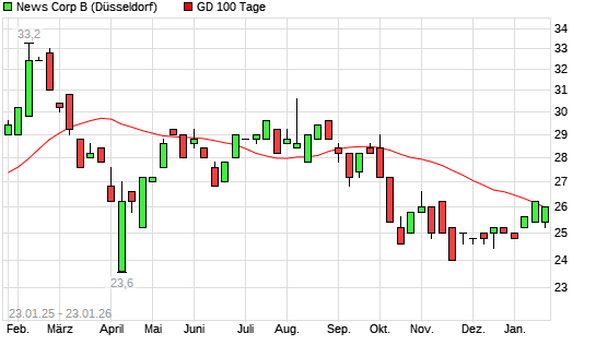 Mit dem Anstieg auf 26,20 EUR hat die News Corp B-Aktie am 22.01.2026 die 100-Tage-Linie nach oben gekreuzt.