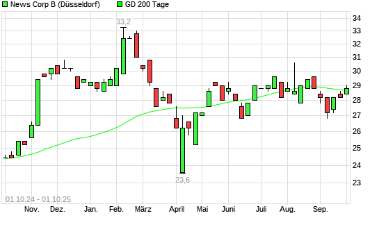 Mit dem Anstieg auf 29,20 EUR hat die News Corp B-Aktie am 30.09.2025 die 200-Tage-Linie nach oben gekreuzt.