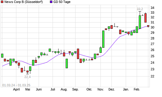 Mit dem Anstieg auf 30,40 EUR hat die News Corp B-Aktie am 28.02.2025 die 50-Tage-Linie nach oben gekreuzt.