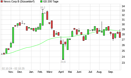 Mit dem Rücksetzer auf 27,60 EUR hat die News Corp B-Aktie am 01.10.2025 die 200-Tage-Linie nach unten gekreuzt.