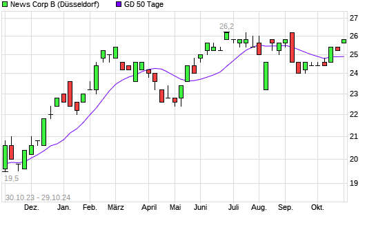 Mit dem Rücksetzer auf 25,00 EUR hat die News Corp B-Aktie am 28.10.2024 die 50-Tage-Linie nach unten gekreuzt.