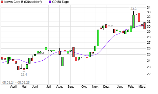 Mit dem Rücksetzer auf 30,40 EUR hat die News Corp B-Aktie am 04.03.2025 die 50-Tage-Linie nach unten gekreuzt.