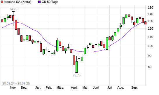 Mit dem Rücksetzer auf 127,20 EUR hat die Nexans-Aktie am 29.09.2025 die 50-Tage-Linie nach unten gekreuzt.