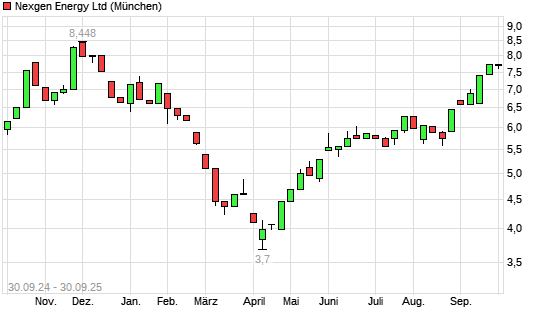 Mit dem Anstieg auf 7,86 EUR hat die Nexgen Energy-Aktie (ISIN CA65340P1062) am 29.09.2025 ein neues 6-Monats-Hoch erreicht und damit den Kurs vom 24.09.2025 eingestellt.